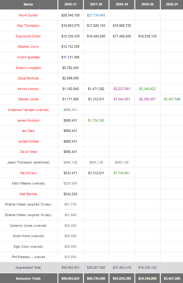 Per i primi grattacapi ci sarà da attendere l’estate 2019 e quella 2020 quando scadranno i vantaggiosissimi contratti di Klay Thompson e Draymond Green.