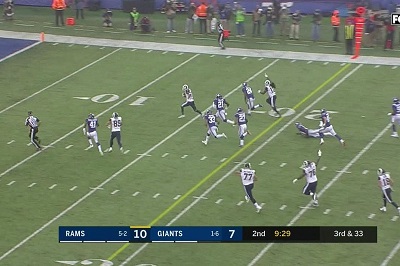 I Giants ne hanno combinate di tutti i colori: hanno perso con una differenza di 34 punti, permesso agli avversari di segnare in otto possessi su nove nei primi tre quarti, e concesso sei giocate superiori alle trenta yard, compreso l’infame touchdown regalato a Robert Woods in occasione di una conversione di un terzo down con t-r-e-n-t-a-t-r-e yard da prendere, episodio-chiave per comprendere l’atteggiamento complessivamente negativo di squadra. Il riesame dell’azione denota una pessima reazione difensiva corale, il passaggio era uno screen da difendere in modo agile visti i sette defensive back impiegati nello specifico, ed il linguaggio del corpo resta un qualcosa di misterioso. Vedere Landon Collins prendere un angolo di placcaggio completamente sbagliato per poi tentare una goffa rincorsa ed osservare Eli Apple correre dietro all’avversario con la stessa velocità di un bradipo equivalgono a gesta inaccettabili in ambito professionistico, una caduta nel ridicolo che evidenzia mancanza di orgoglio.