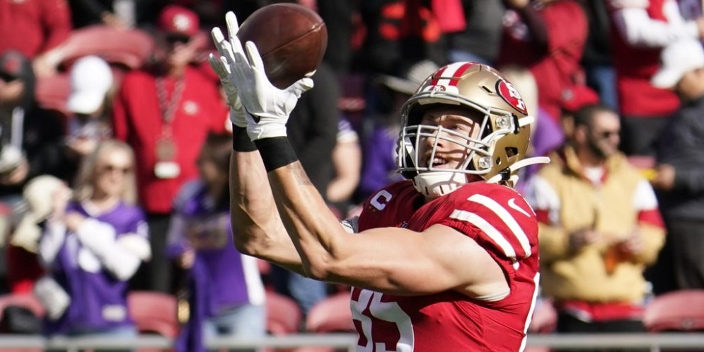 Vikings 49ers Football 12/01/2020 davelavarra Previous Next San Francisco 49ers tight end George Kittle (85) warms up before an NFL divisional playoff football game against the Minnesota Vikings, Saturday, Jan. 11, 2020, in Santa Clara, Calif. (AP Photo/Tony Avelar)
