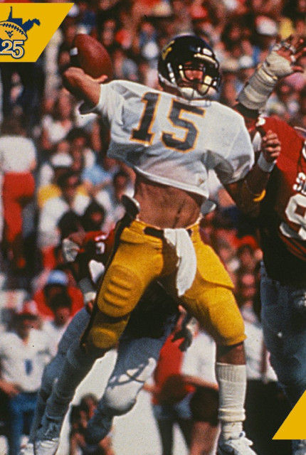 Conquistatosi il diritto per una borsa di studio da studente-atleta presso la vicina Penn State University gioca con i Nittany Lions 3 partite nel corso della freshman season, 1980, ma dopo aver perso lo starting spot in favore di Todd Blackledge decide di trasferirsi a West Virginia, ed osservato l’anno di pausa post trasferimento previsto dalle normative NCAA diventa QB titolare dei Mountaineers a partire dalla stagione 1982 e il suo esordio è di quelli indimenticabili, lanciando per 321 yards e 4 TD pass in casa degli Oklahoma Sooners, numeri 9 del ranking, per una vittoria 41-27 che all’epoca fece parecchio scalpore.