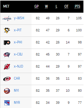 La squadra dei big three Crosby, Malkin e Kessel (279 punti in tutto) sono il pericolo principale dei Philadelphia Flyers che, arrivati terzi nella metropolitan, daranno vita all’ennesimo capitolo della guerra nei playoff, nonostante una regular season completamente a favore dei pinguini.
