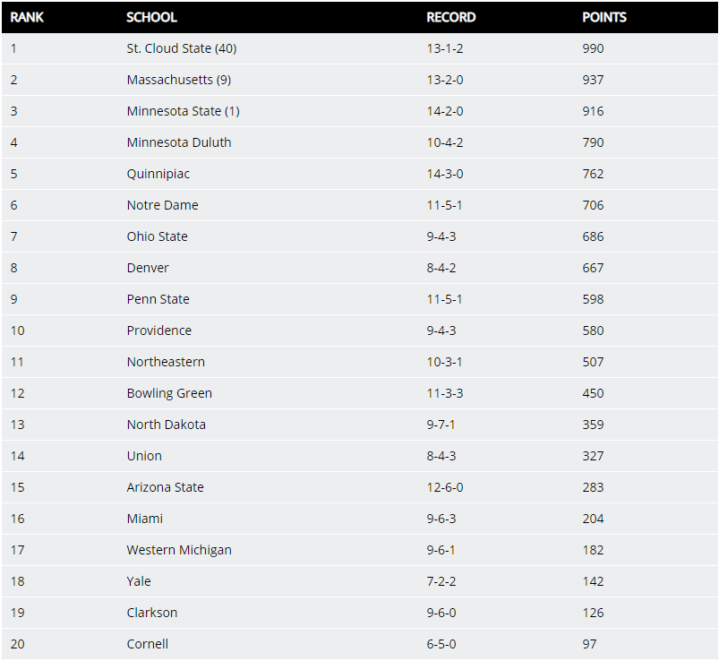 I vari esperi dunque vedono St. Cloud State come favorita davanti Massachusetts e Minnesota State. “Solo” quarti invece i Minnesota-Duluth Bulldogs, i campioni in carica non convincono del tutto nonostante un buon record parziale, non partirono comunque favoriti nemmeno lo scorso anno prima della conquista del titolo nazionale.